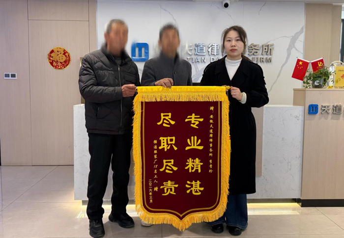 近日,一面印着“专业精湛、尽职尽责”的锦旗被送到安徽天道律师事务所李贵珍律师手中,徐某等人紧紧握住李贵珍律师的手,连声表达感谢。这面锦旗,不仅是对李贵珍律师专业办案的肯定,更是对安徽天道律师事务所多年来深耕法律援助公益事业、践行律师社会责任的最好褒奖。此次李贵珍律师历时近两个月,为19名劳动者成功追回拖欠八年的27万余元工资,只是天道律所众多公益法援案例中的一个缩影,更是天道律所始终以法治力量为弱势群体撑起“保护伞”的生动实践。