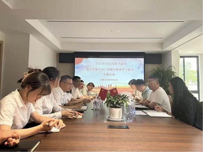 建党104周年即将来临之际,为持续深入贯彻**八项规定精神,切实提升律师行业党员的政治素养和党性修养,充分发挥党员律师在法治建设中的先锋模范作用,2025年6月26日,天长市司法局党组成员、副局长卢宏军,天长市司法局法律援助**主任卢建龙、天长市司法局公法股股长吴清怡等领导莅临安徽天道律师事务所,党组成员、副局长卢宏军同志为本所律师上了一堂主题鲜明、内容深刻的专题党课——深化党员修养 践行先锋模范。